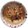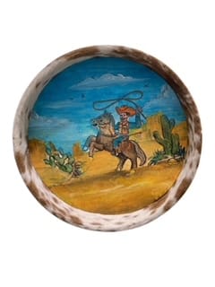 round serving tray with handles, leather backed with cowhide sides